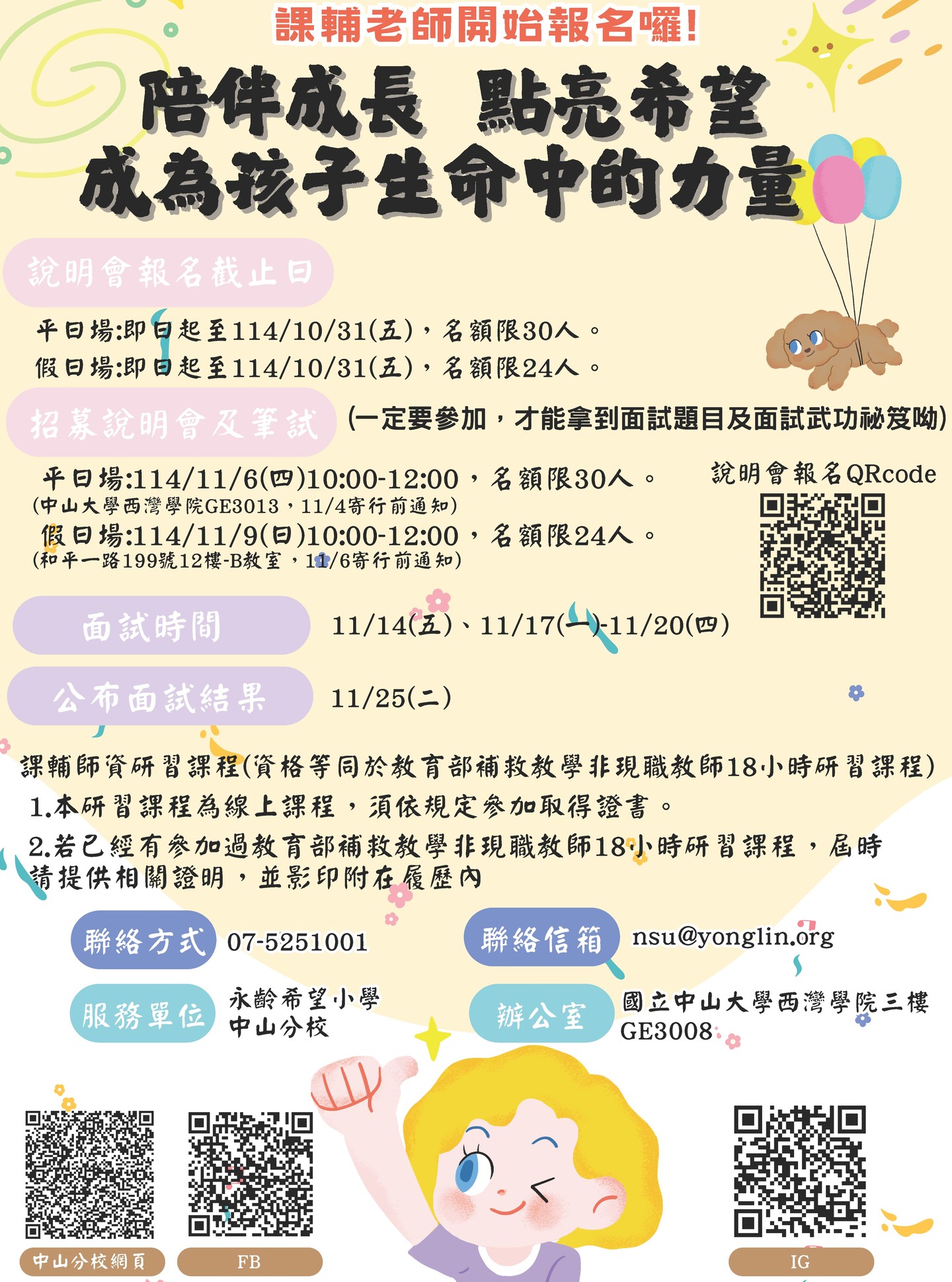 ※114-3暑期課輔期間為115年7月-8月初 (目前暑假課程暫時不會安排新任老師入班,如果想要擔任暑期的老師,需要在114-2學期就進行初次的服務唷)