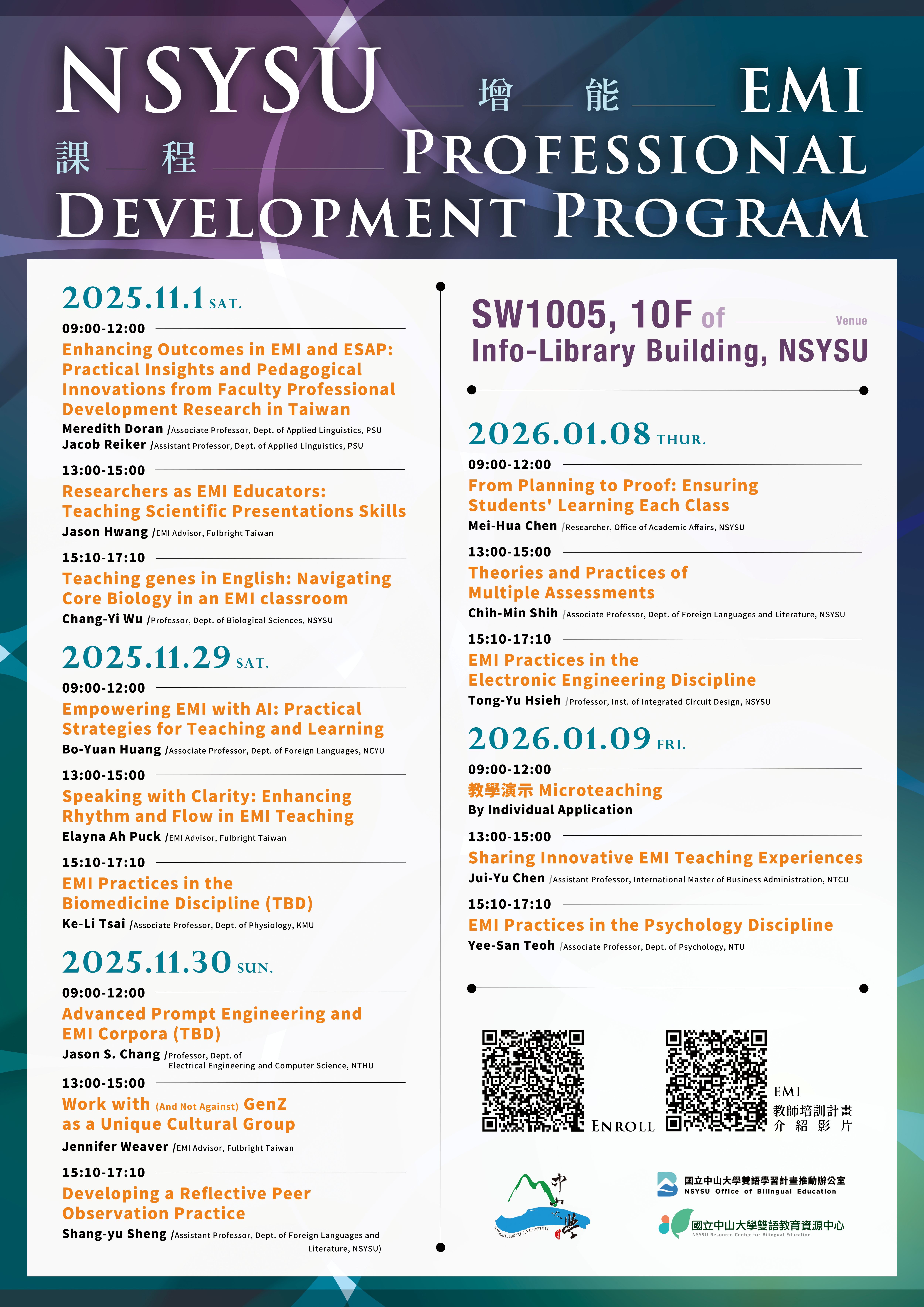 NSYSU Resource Center for Bilingual Education's 114-1 EMI Professional Development Program is open for enrollment!