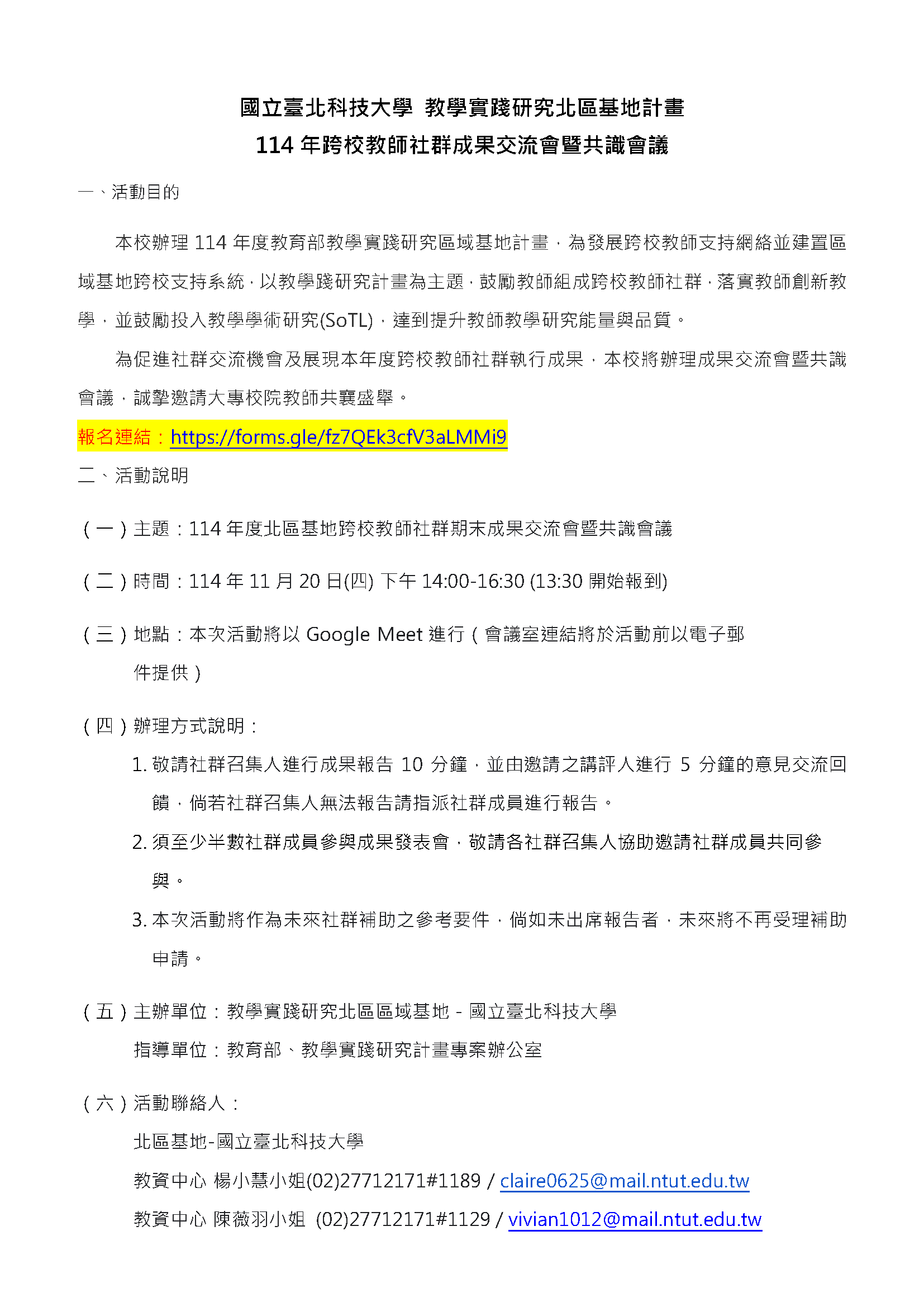 (七)聯絡資訊:國立臺北科技大學教學資源中心陳薇羽小姐,電話:(02)2771-2171#1129,Email:vivian1012@mail.ntut.edu.tw