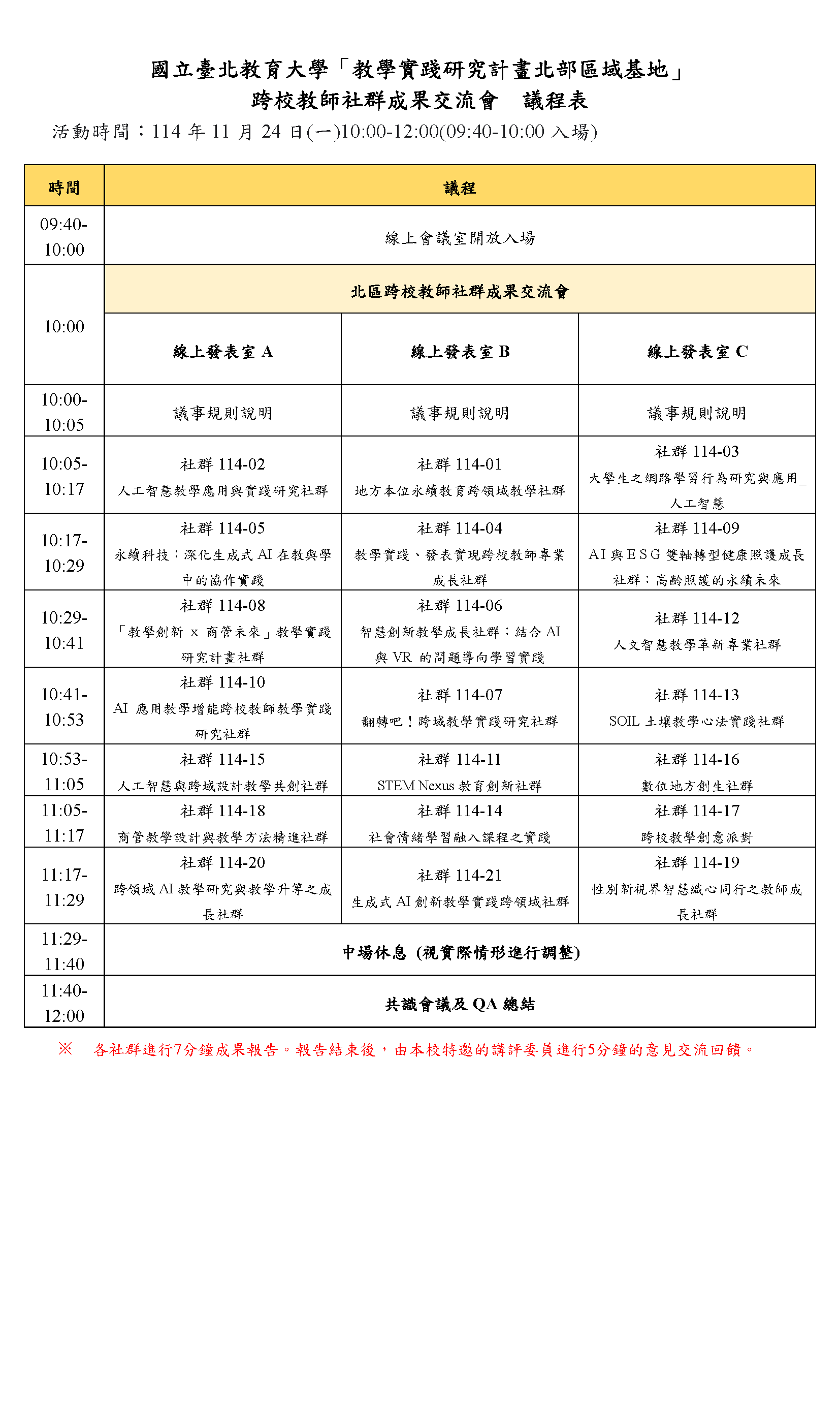 三、檢附活動議程、海報供參。相關資訊同步公告於本校教學實踐研究計畫區域基地網站(https://tpr.ntue.edu.tw /)及教學實踐粉絲團(https://tpr.ntue.edu.tw/s/FB)。