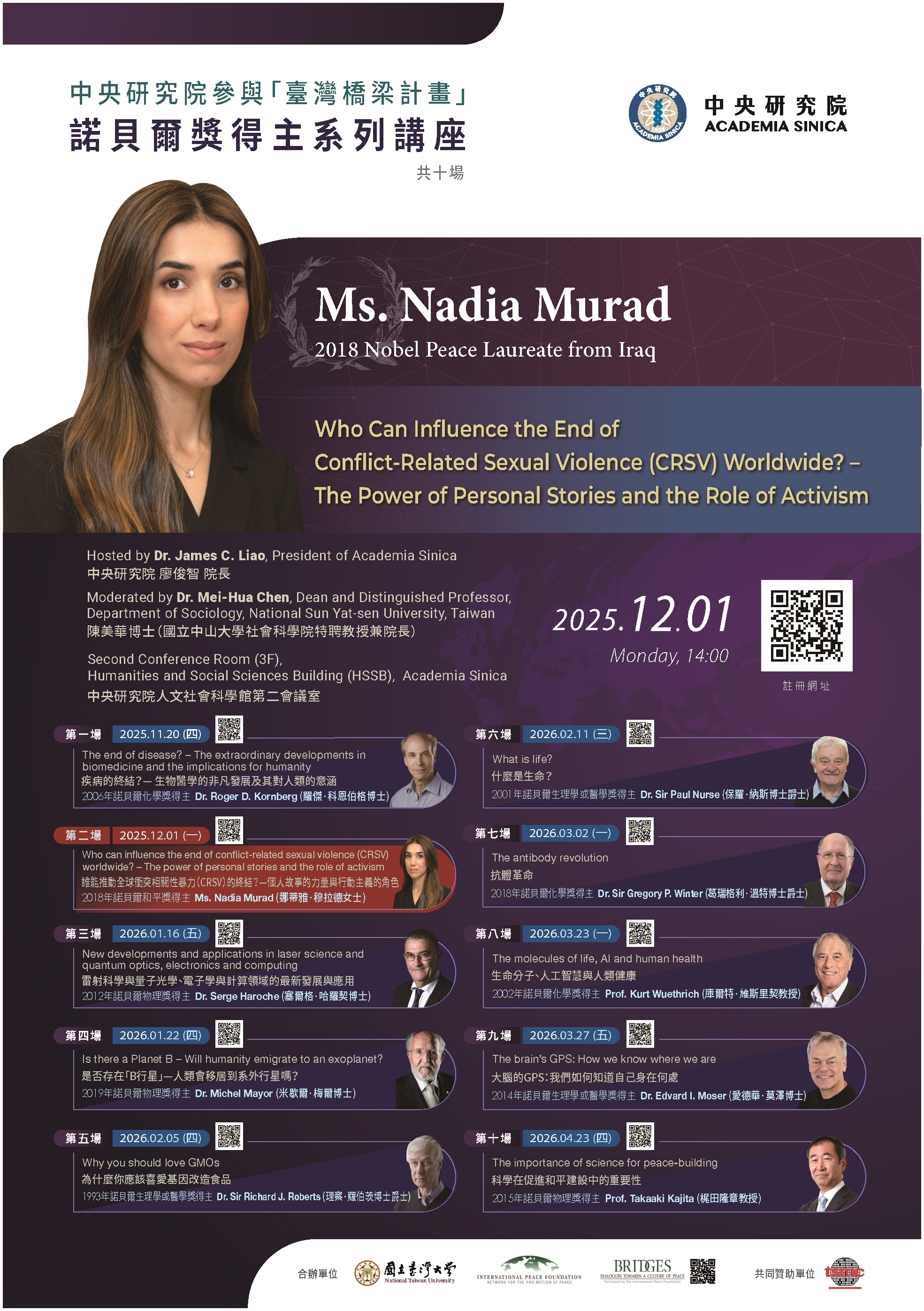 中央研究院來函-本院參與「臺灣橋梁計畫」(TAIWAN BRIDGES)邀請諾貝爾和平獎得主娜蒂雅.穆拉德女士(Ms. Nadia Murad)蒞院發表專題演講,請惠予公告週知。