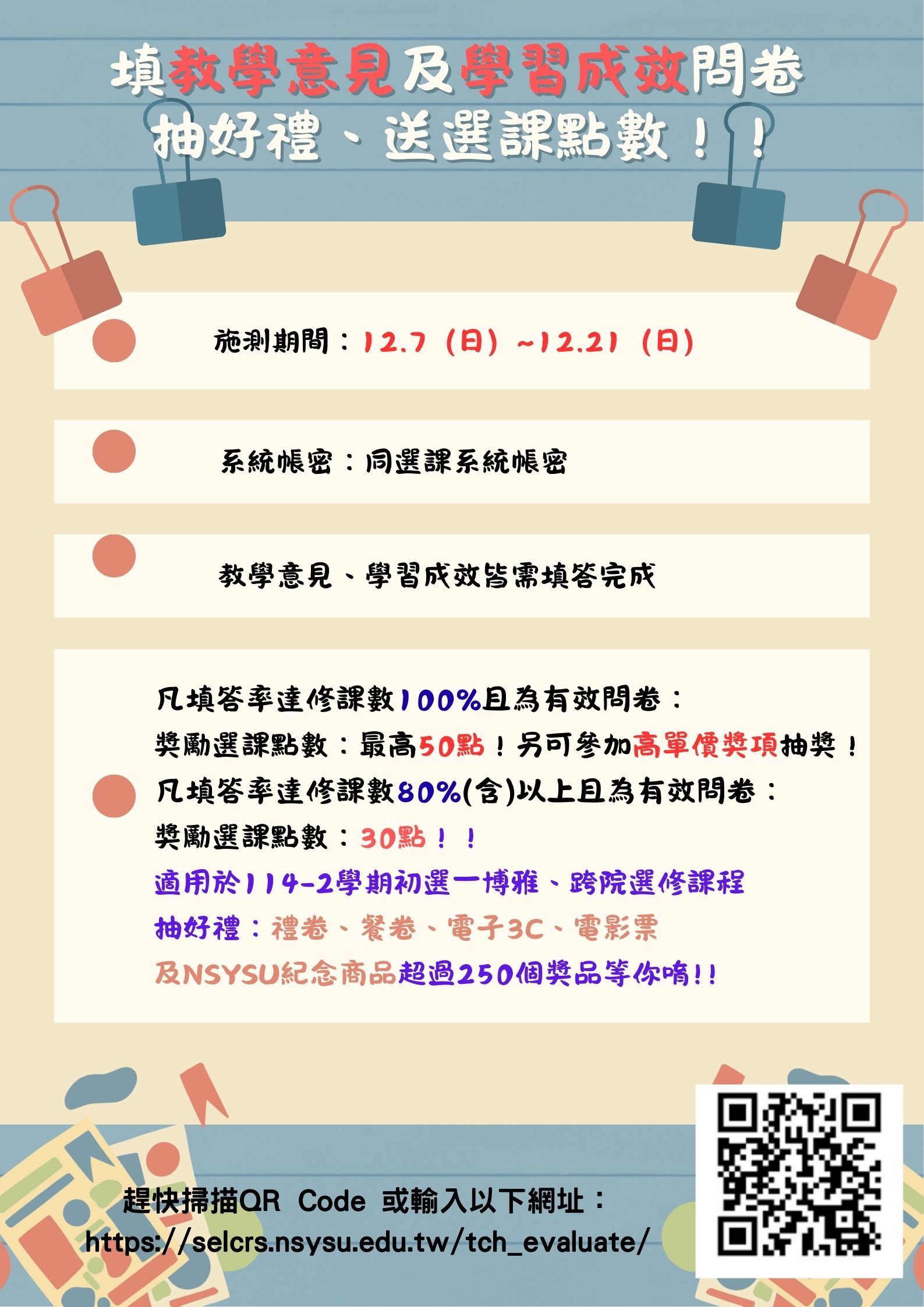 ★Website:https://selcrs.nsysu.edu.tw/tch_evaluate/