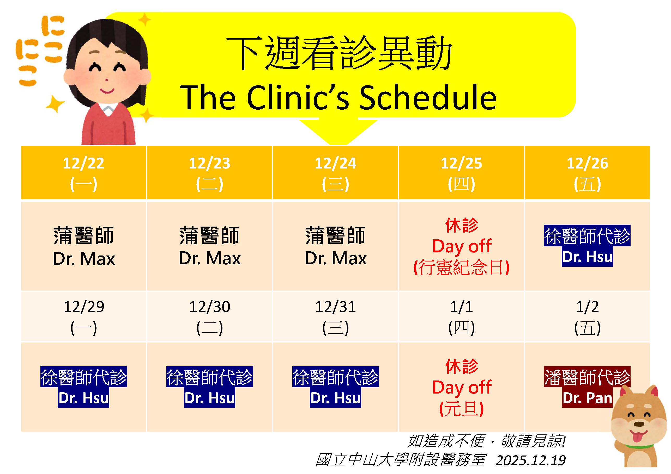 Substitute physicians will be on duty from December 26, 2025 to January 3, 2026.