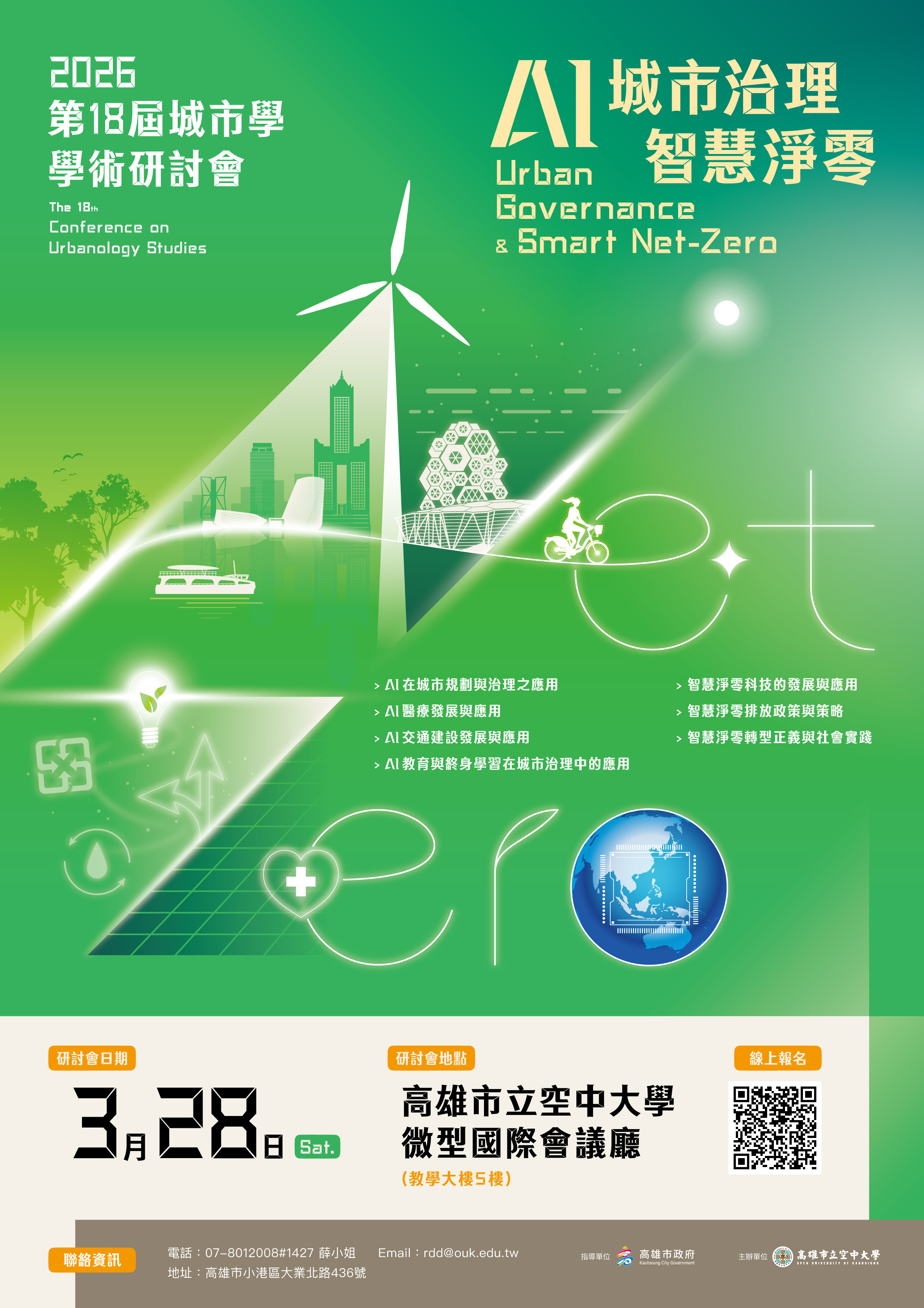 高雄市立空中大學訂於115年3月28日(星期六)舉辦「第十八屆城市學學術研討會」,主題為「AI城市治理 智慧淨零」,敬請惠予公告周知並鼓勵踴躍報名參加,請查照。