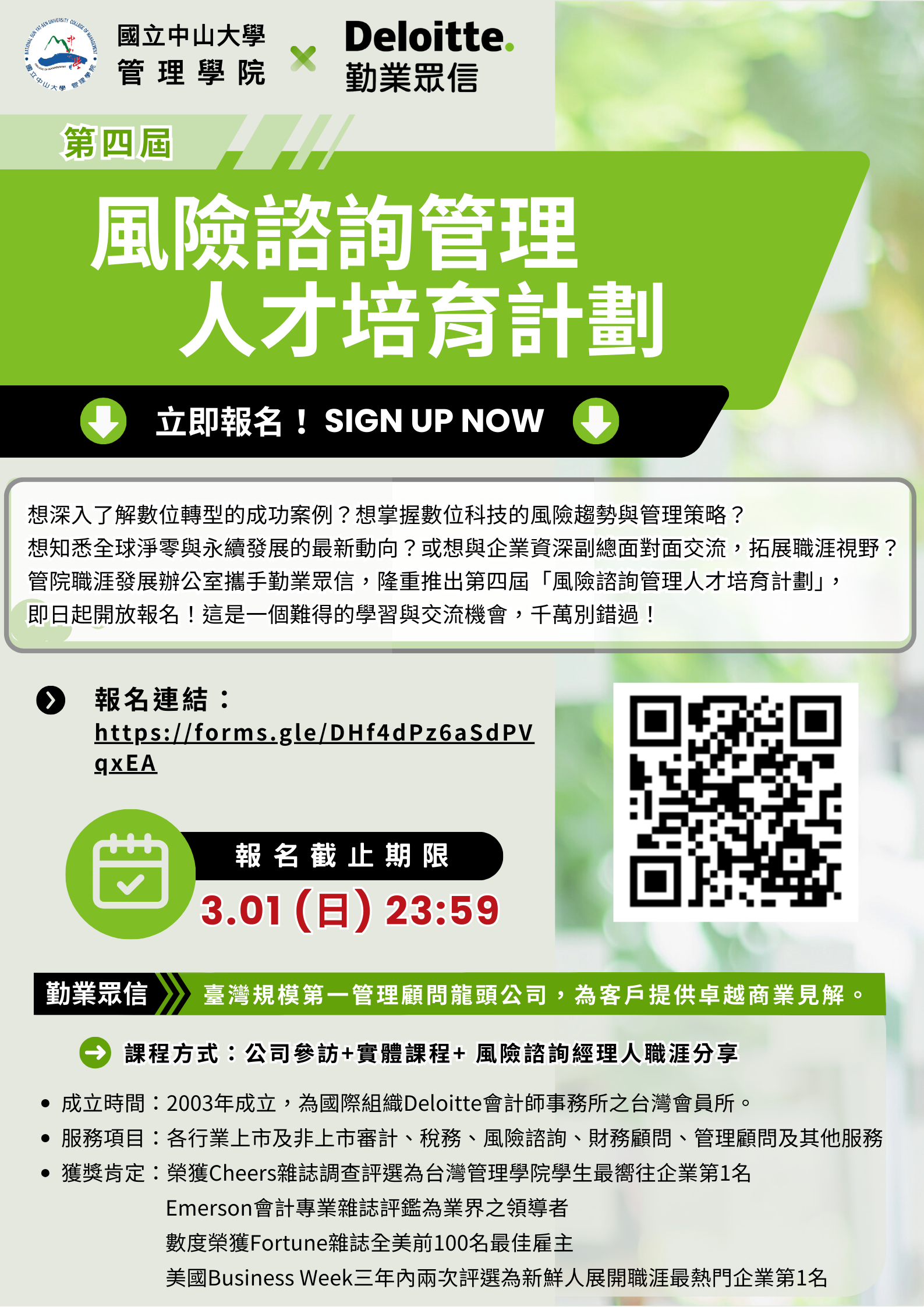 管院職涯發展辦公室攜手勤業眾信,隆重推出第四屆「風險諮詢管理人才培育計劃」,即日起開放報名!