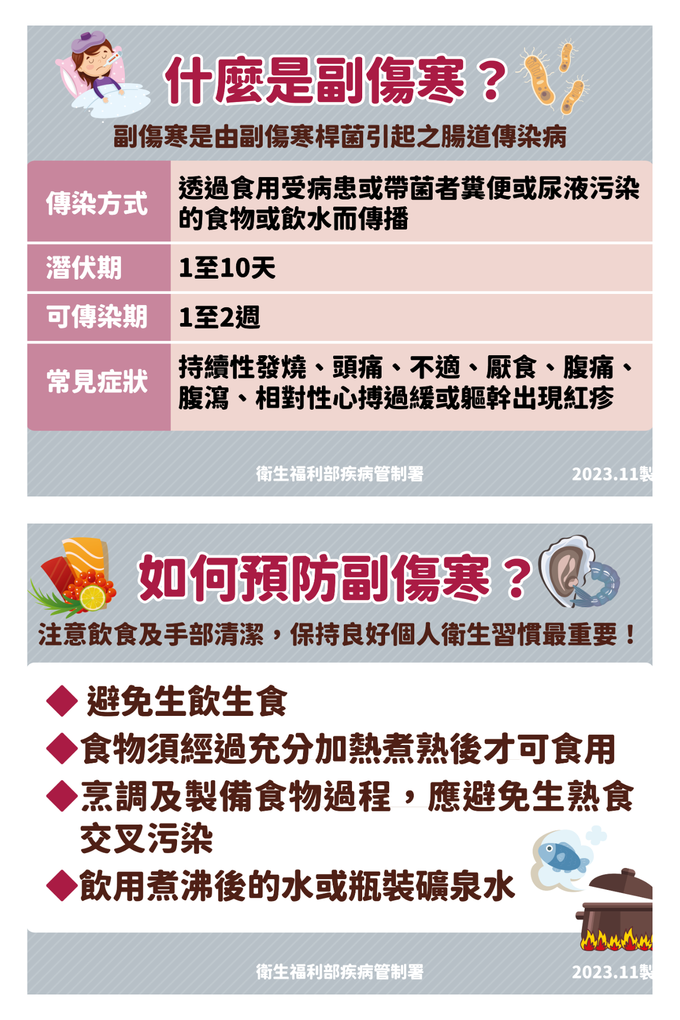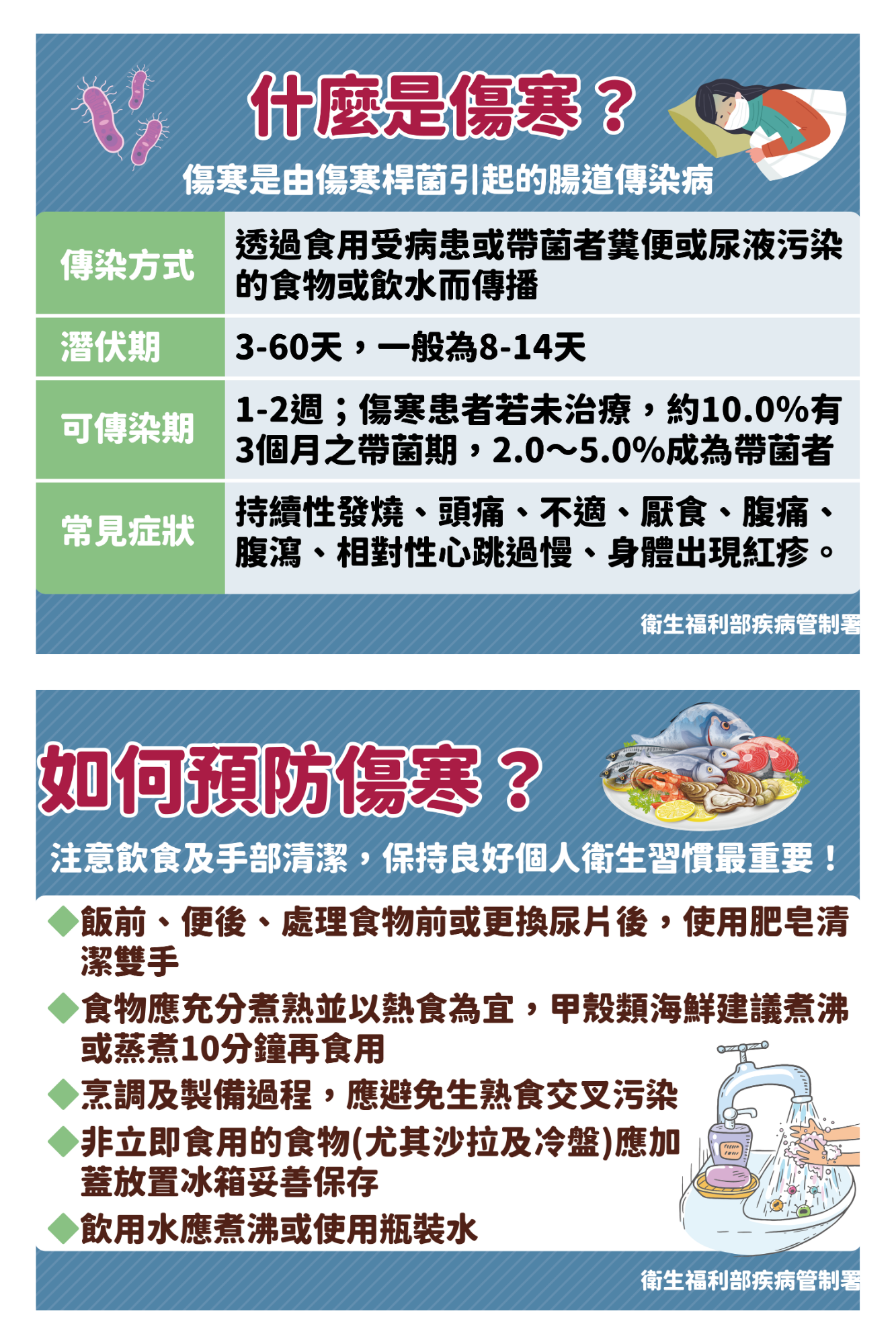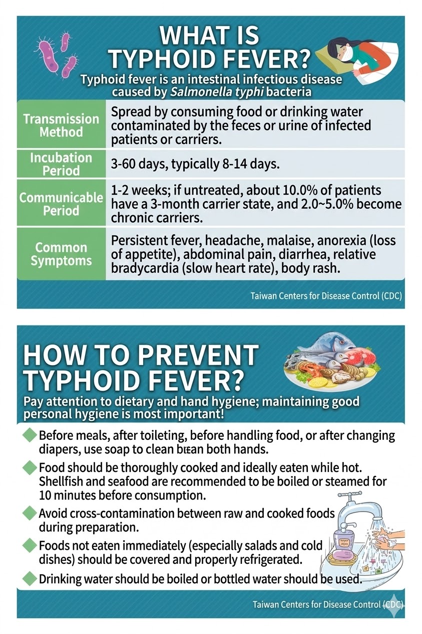 傷寒與副傷寒為第二類法定傳染病,請注意「勤洗手、吃熟食」。