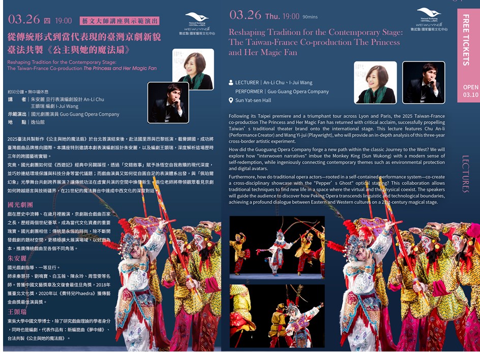 國光劇團 GuoGuang Opera Company國光劇團團員以及朱安麗、王顗瑞,一起來為觀眾深度解析如何從《西遊記》經典劇碼抽絲剝繭,巧妙連結現代語彙,臺法共製在21世紀的魔法舞台中讓東西文化的深度對話。