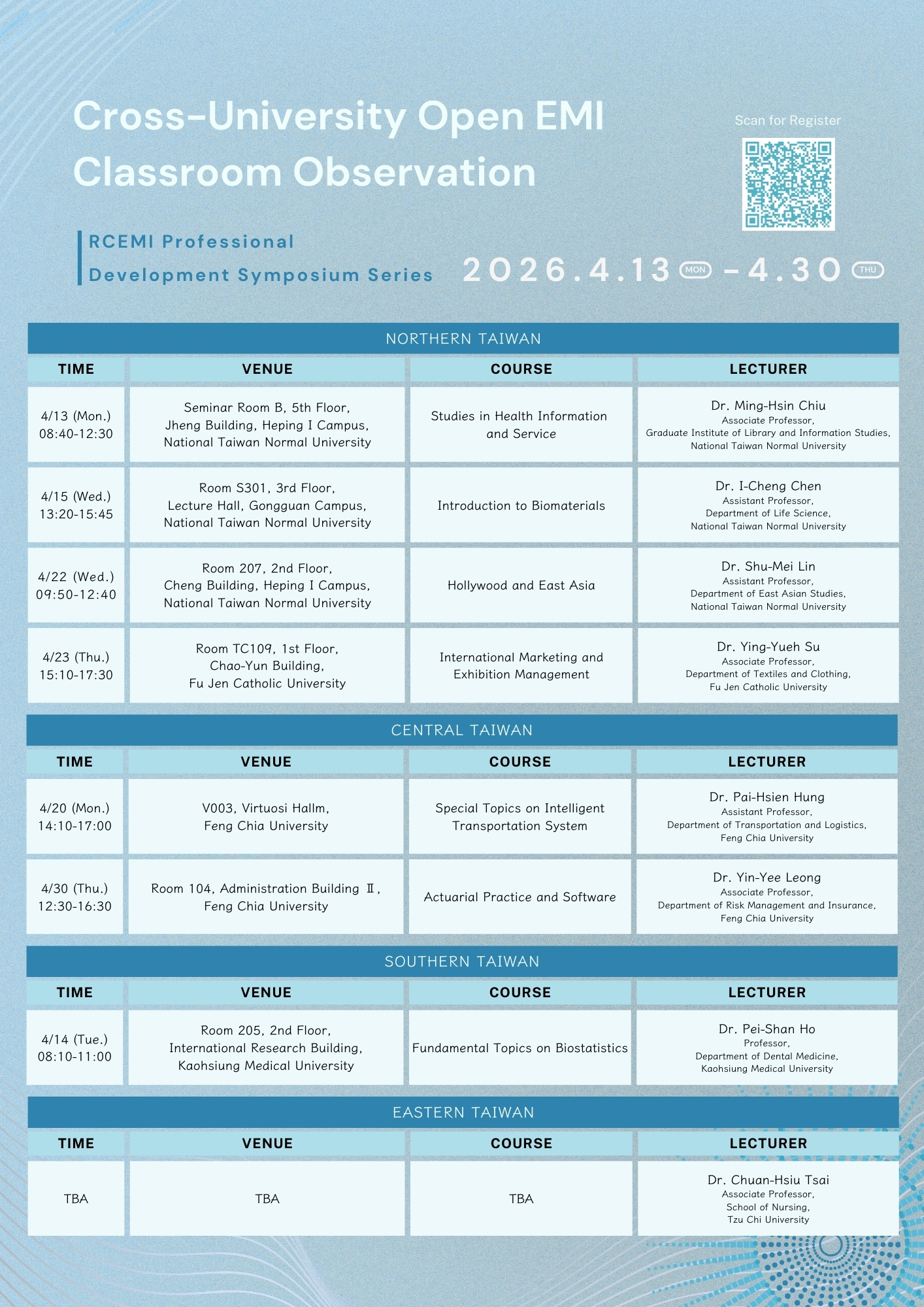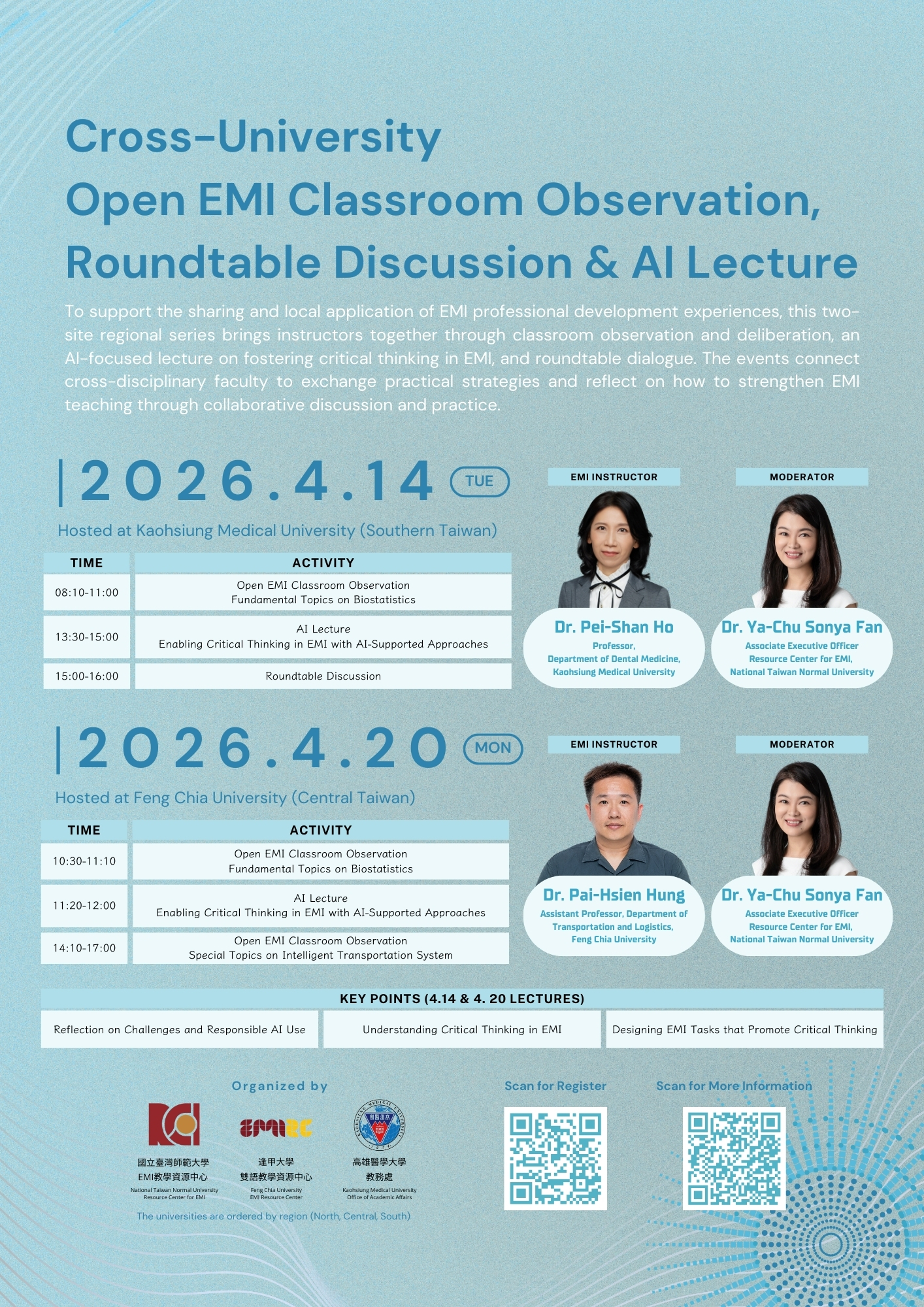 國立臺灣師範大學 EMI 教學資源中心辦理雙語聯盟跨校公開觀議課、圓桌會議及 AI 講座相關資訊