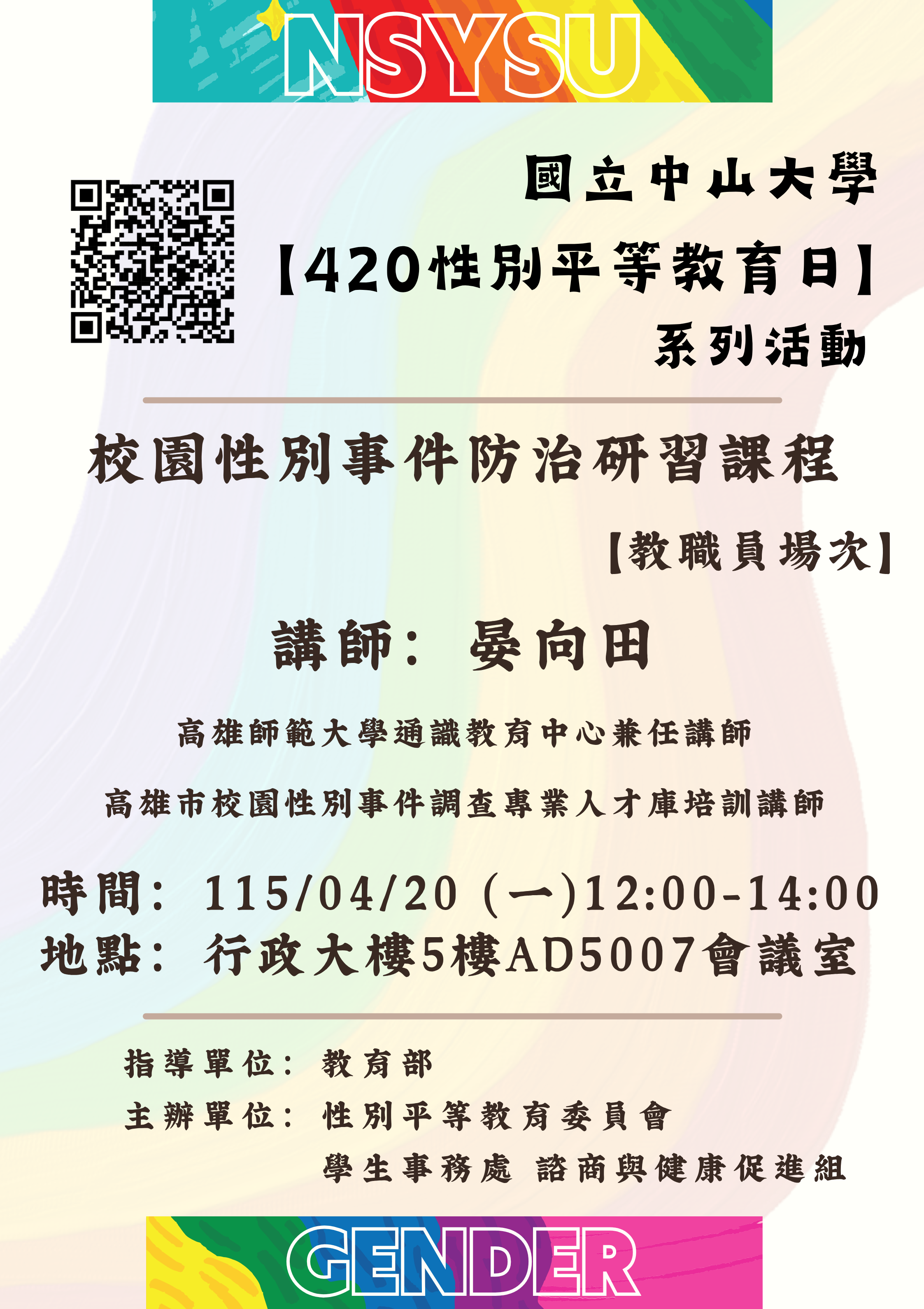 有關本校辦理「校園性別事件防治研習課程」場次乙案,詳如說明,敬請轉知所屬教職員工躍報名參加,請查照。
