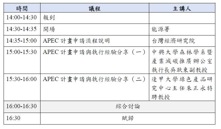 APEC為鼓勵會員體之能力建構,提供執行計畫之經費補助,本場說明會之目的,為鼓勵國內公私部門善用APEC平台與資源,積極提案申請APEC基金,特別是針對能源領域之APEC能源效率、低碳與能源韌性措施子基金(Energy Efficiency, Low Carbon and Energy Resiliency