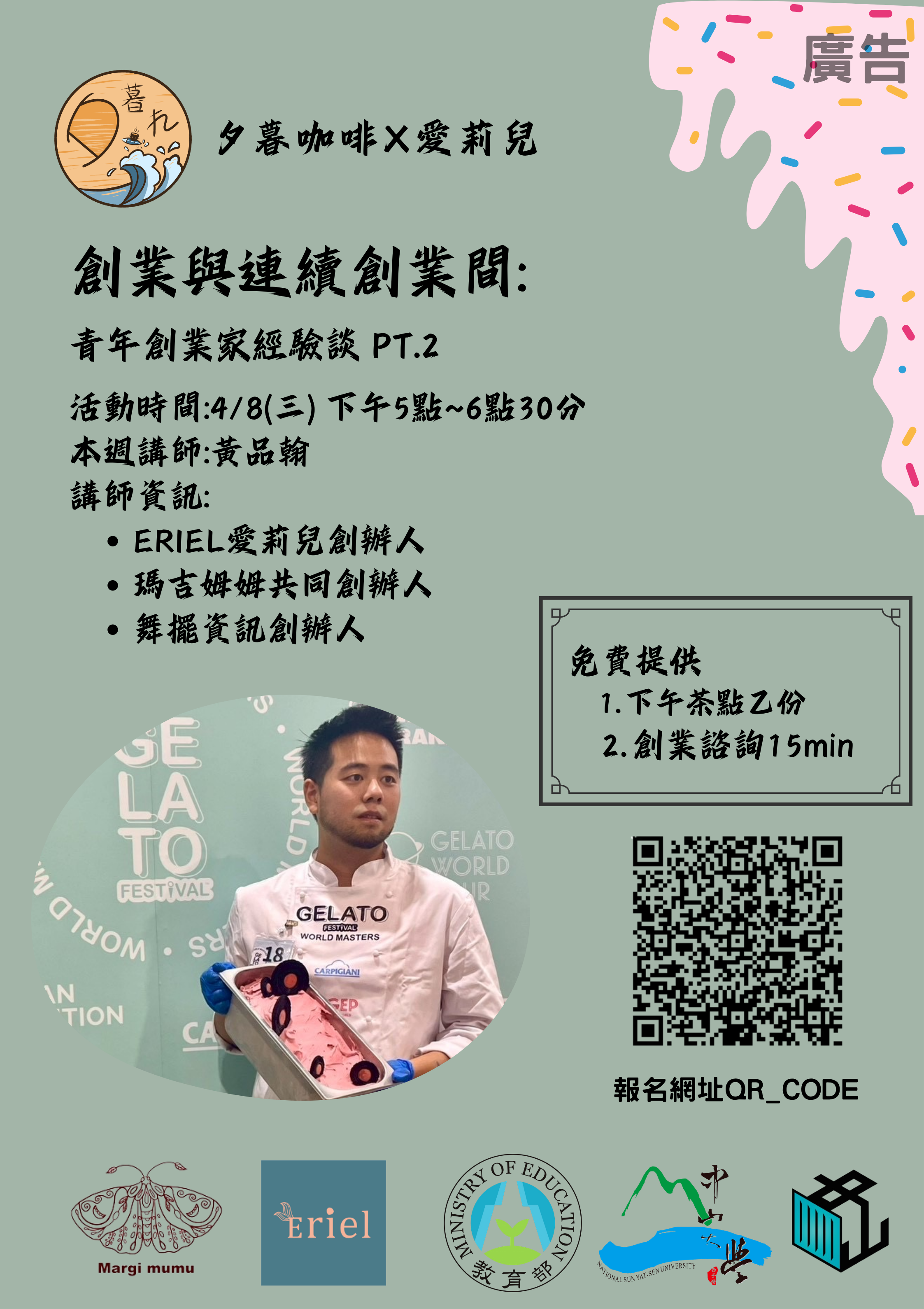 本次講座將由講師以自身經歷出發,分享自己如何在不同創業階段中,看見機會、整合資源、做出選擇,並一步步從單點嘗試,走向連續創業的思維與行動。