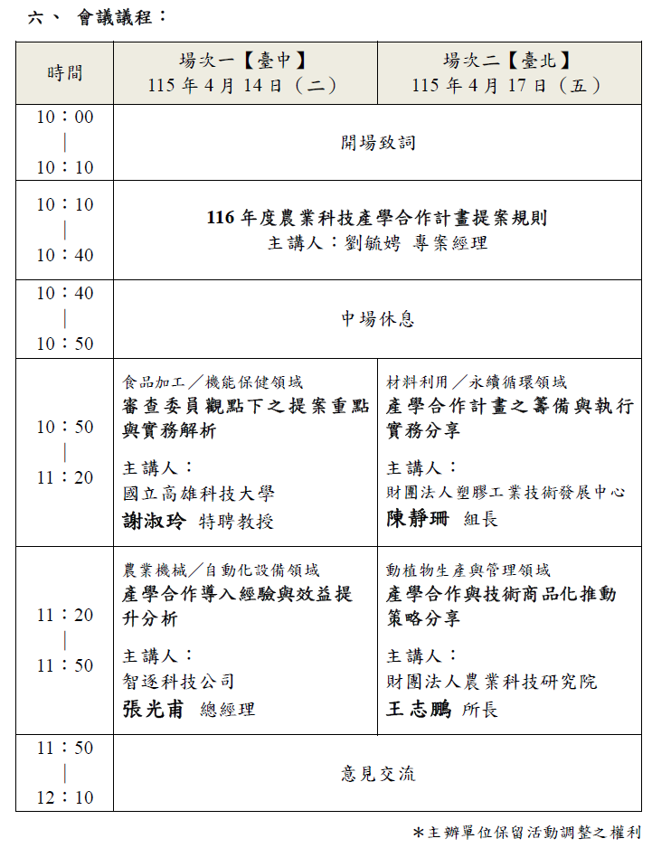 參加對象:有意申請或瞭解116年度農業科技產學合作計畫之主持人及其團隊成員與合作業者 。