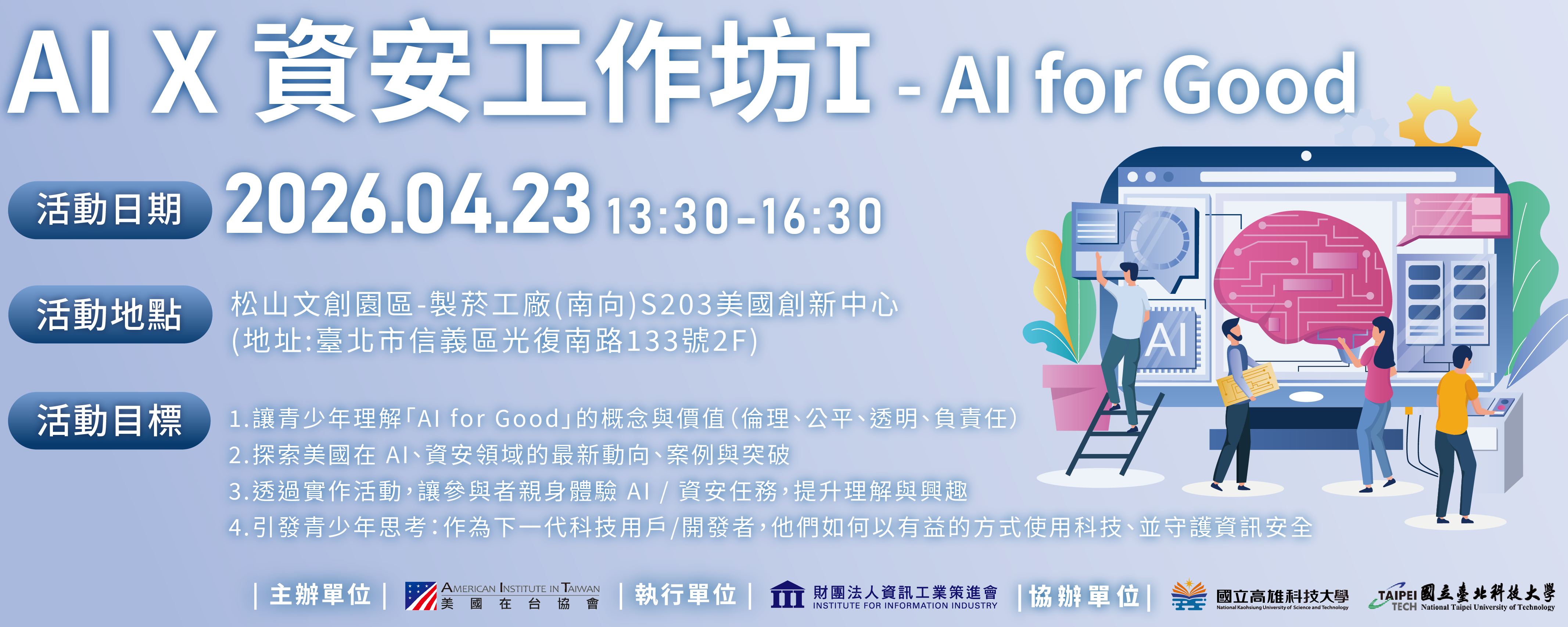 財團法人資訊工業策進會函,該會受AIT美國在台協會委託規劃辦理兩場系列活動,請轉知並鼓勵師生踴躍報名參與,請查照。