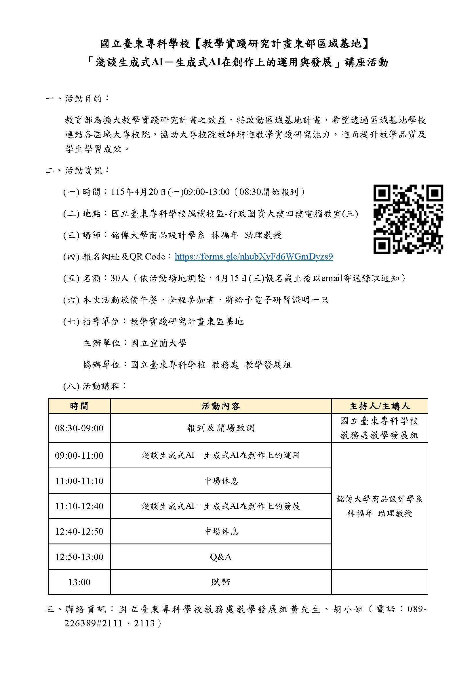 三、聯絡資訊:本校教務處教學發展組黃先生、胡小姐(電話:089-226389分機2111、2113;E-mail:weijyun@ntc.edu.tw、chi0924@ntc.edu.tw)。