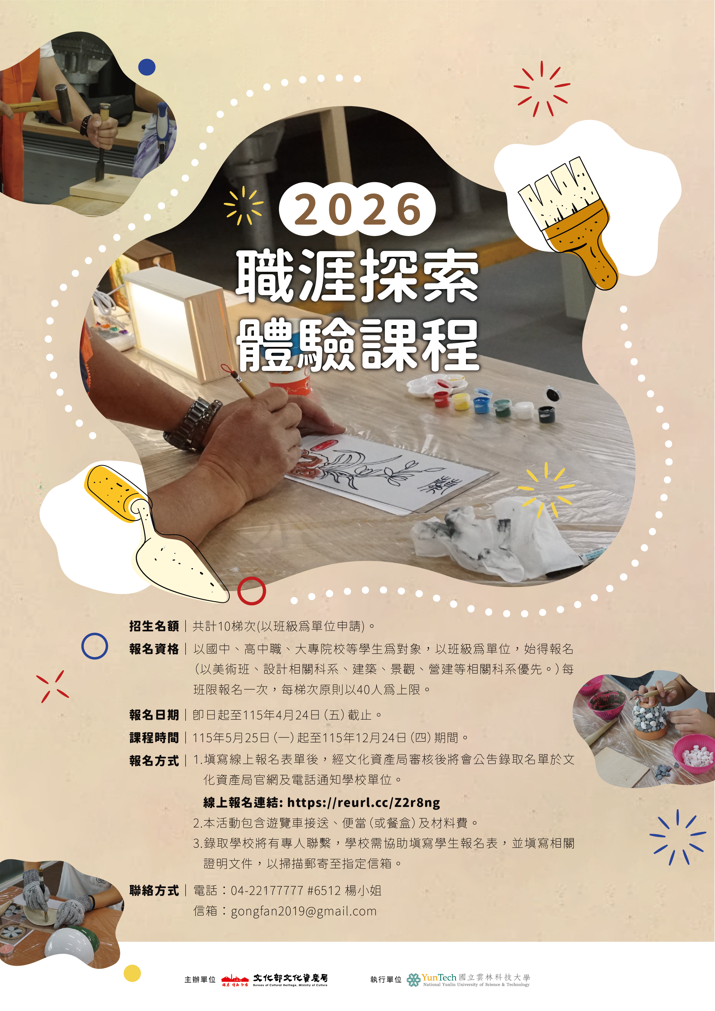 文化部文化資產局(下稱該局)辦理文資傳匠工坊「2026職涯探索體驗課程」,請協助轉知所屬並鼓勵踴躍報名參加,請查照。